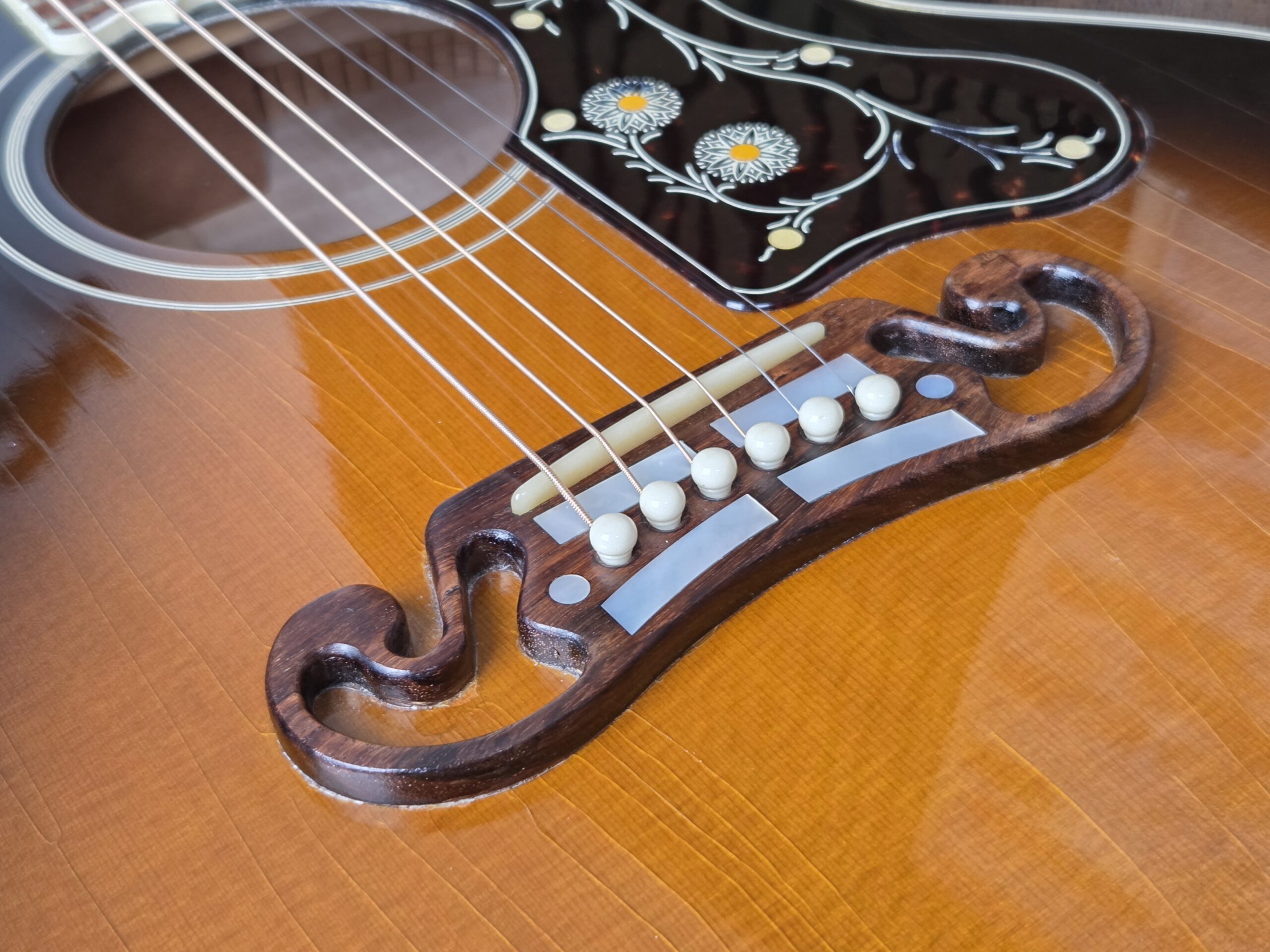 The instrument on offer here dates back to 1999 and has been played in for over two decades. This is exactly what you can hear and feel. The top has several fine cracks in the nitro lacquer – a typical feature of older Gibson guitars that is now artificially reproduced in the Murphy Lab. On this Gibson SJ-200, however, these lacquer cracks are completely natural. They not only give the guitar an authentic vintage look, but also support the free vibration of the top.