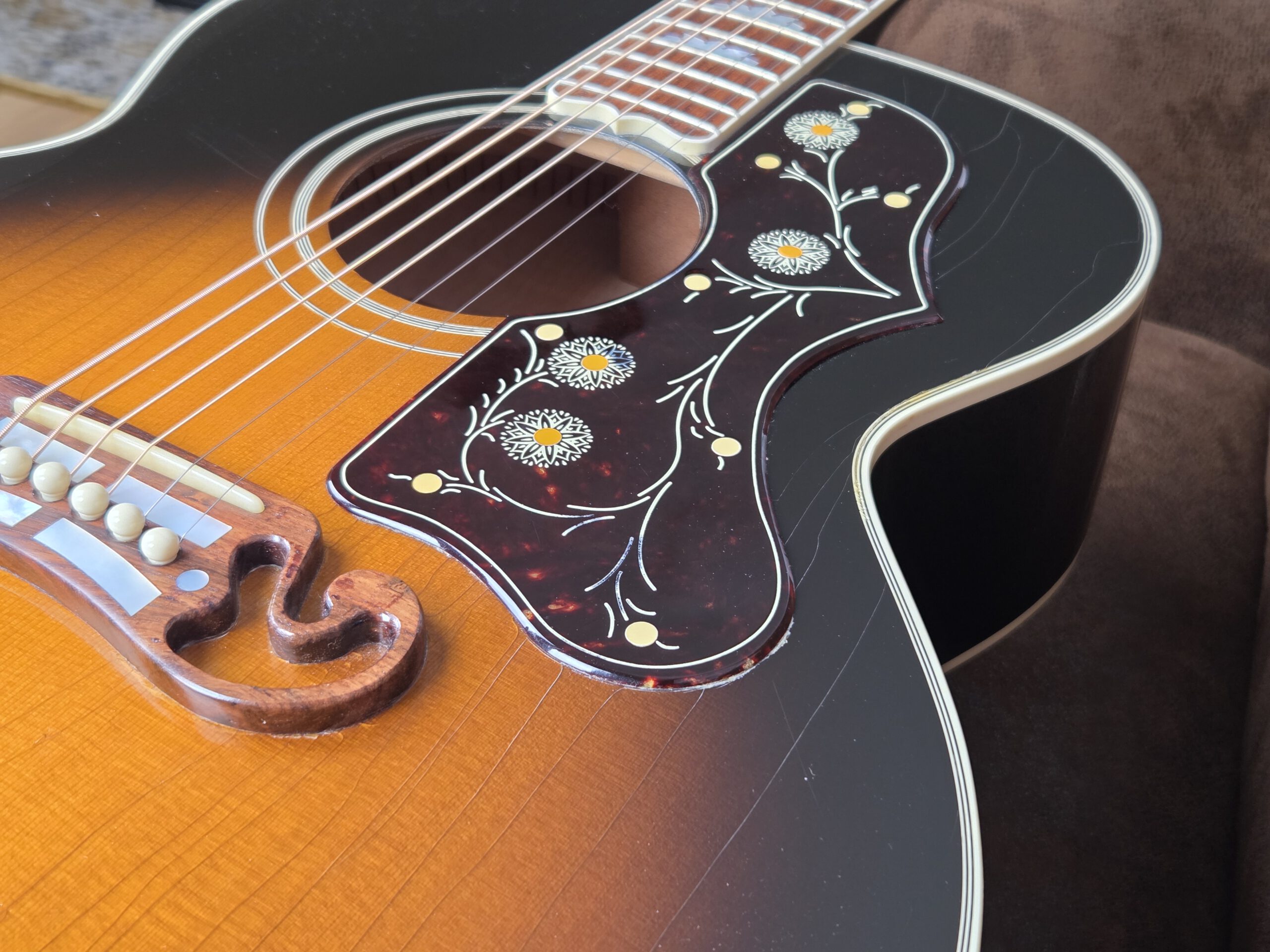 The Gibson SJ-200 is one of the most legendary acoustic guitars ever and is still considered the “King of the Flat-Tops” today. Introduced by Gibson at the end of the 1930s, the Super Jumbo with its imposing body, maple back and elaborately designed appearance had a lasting impact on the sound and appearance of modern acoustic guitars. Hardly any other model stands for size, presence and iconic appearance as much as the Gibson SJ-200.