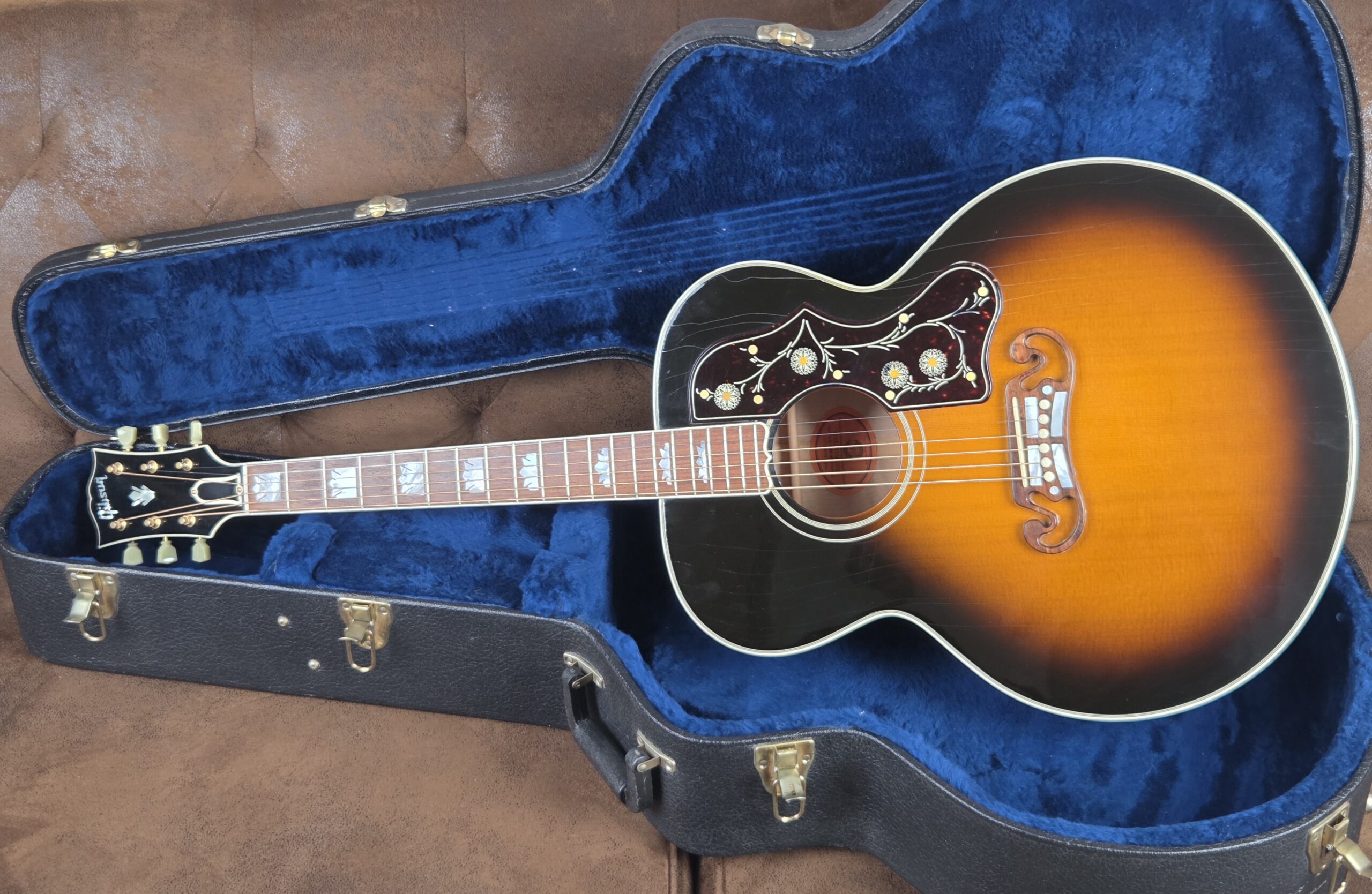 Gibson SJ-200 from 1999, a well-recorded Super Jumbo with Sitka spruce top, flamed maple body, natural nitro patina and a big, full-bodied sound.