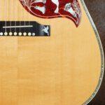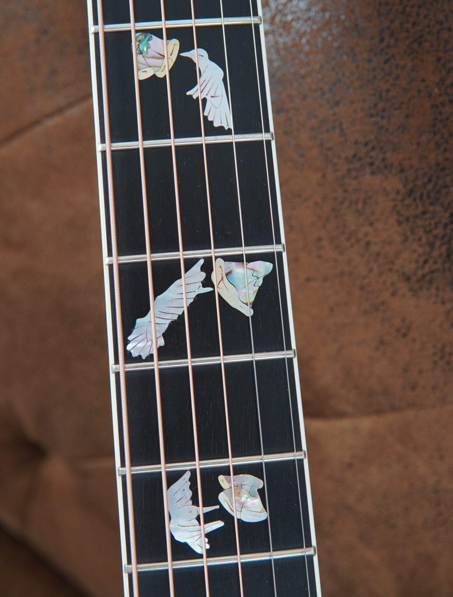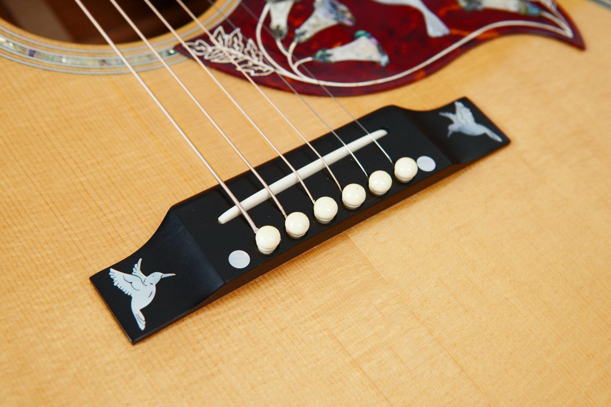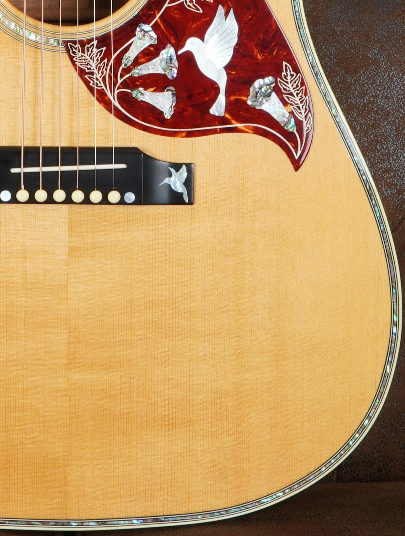 Optisch begeistert die Gibson Hummingbird Custom Koa mit ihrer edlen Ausstattung und Liebe zum Detail. Aufwendige Abalone-Einlagen zieren das Griffbrett, den Steg, die Kopfplatte und das ikonische Hummingbird-Schlagbrett. Die Kombination aus goldenen Grover-Mechaniken mit kunstvollen Gravuren und dem natürlichen Hochglanzfinish des Koa-Holzes ergibt ein harmonisches Gesamtbild, das pure Eleganz ausstrahlt.