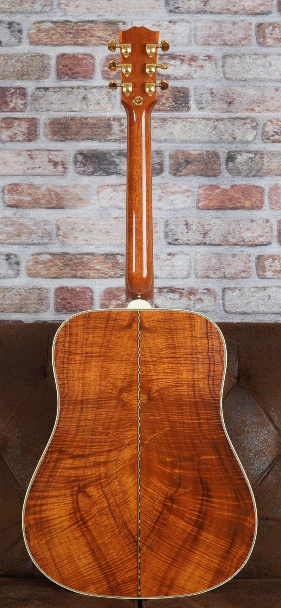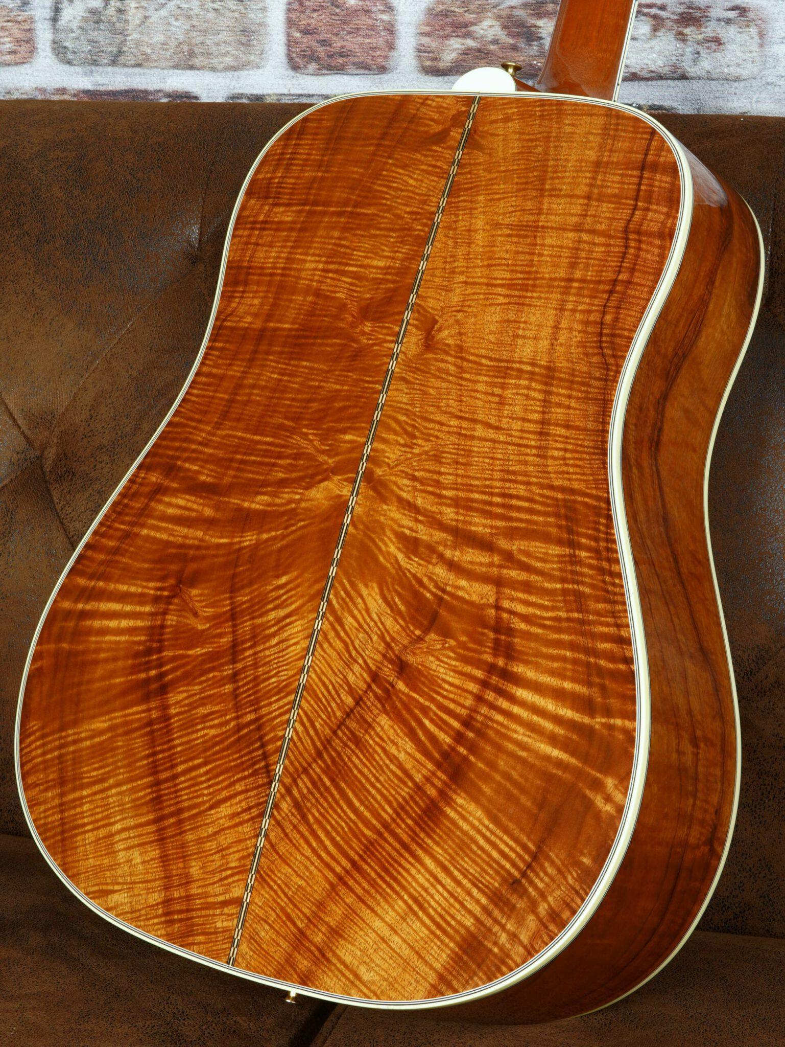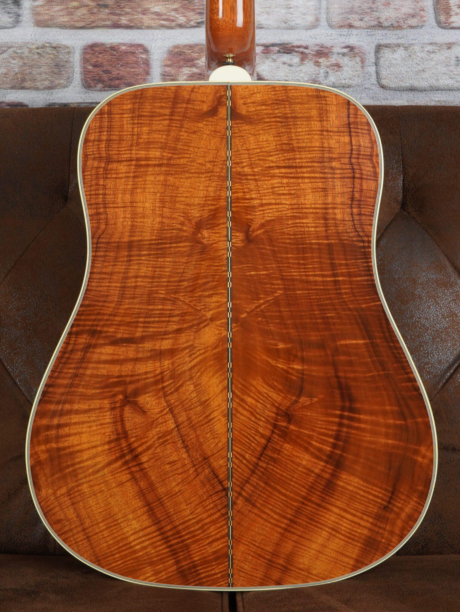 Gebaut wurde diese Hummingbird Custom Koa im Jahr 2010 und sie kombiniert eine massiv gemaserte AAA Flamed Koa für Boden und Zargen mit einer fein ausgewählten AA Sitka-Fichtendecke. Diese Verbindung sorgt nicht nur für ein atemberaubendes Erscheinungsbild, sondern auch für einen warmen, klaren und dynamisch ausgewogenen Klang. Koa verleiht dem Ton eine elegante Tiefe, während die Sitka-Fichte für Transparenz, Definition und schnelle Ansprache sorgt. Das Resultat ist ein voll klingendes Instrument mit starker Projektion, das sich gleichermaßen für sanftes Fingerpicking wie für ausdrucksstarkes Strumming eignet. Besonders beeindruckend ist die natürliche Kompression, die dem Ton eine weiche, harmonische Rundheit verleiht.