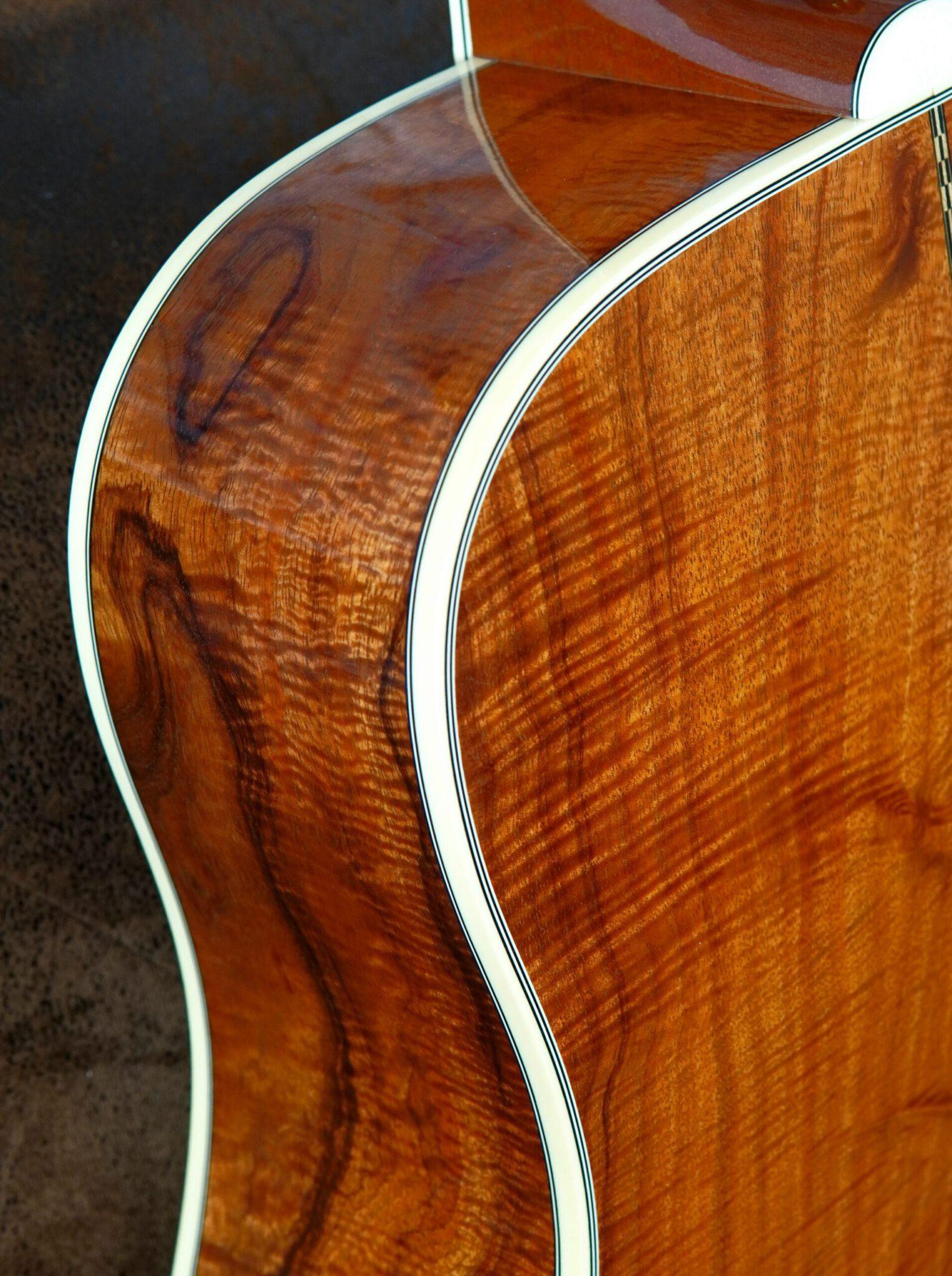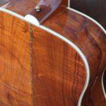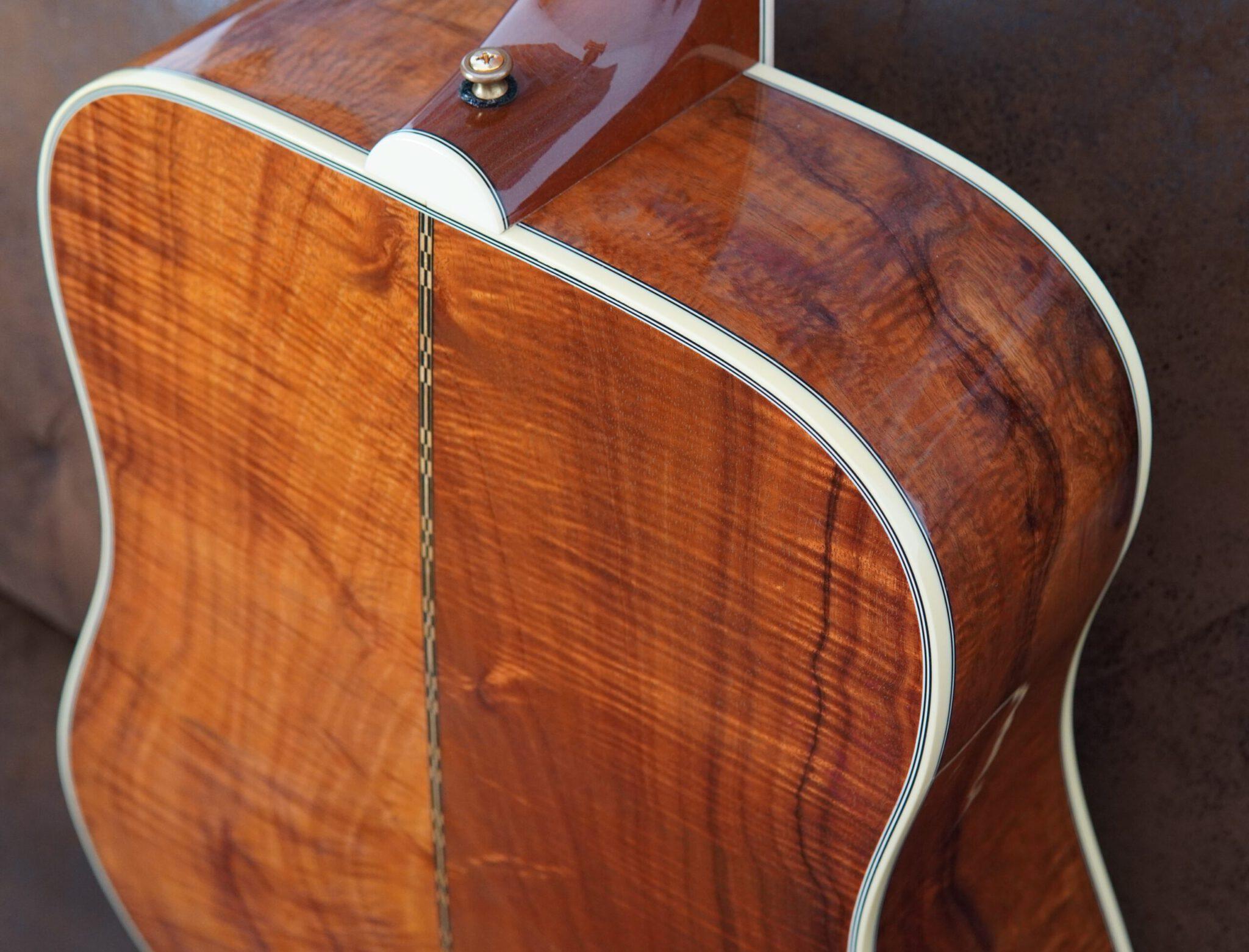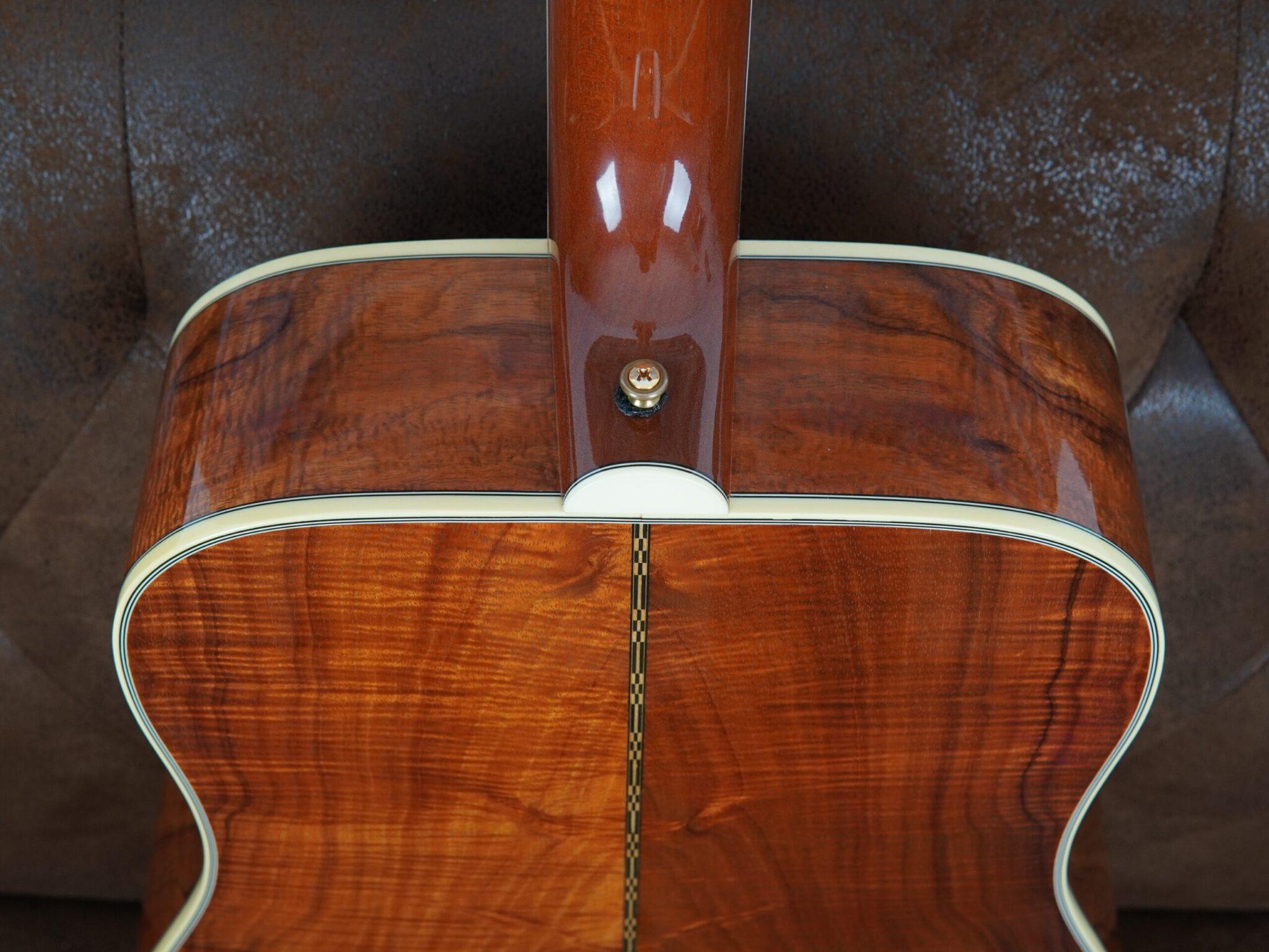 Gebaut wurde diese Hummingbird Custom Koa im Jahr 2010 und sie kombiniert eine massiv gemaserte AAA Flamed Koa für Boden und Zargen mit einer fein ausgewählten AA Sitka-Fichtendecke. Diese Verbindung sorgt nicht nur für ein atemberaubendes Erscheinungsbild, sondern auch für einen warmen, klaren und dynamisch ausgewogenen Klang. Koa verleiht dem Ton eine elegante Tiefe, während die Sitka-Fichte für Transparenz, Definition und schnelle Ansprache sorgt. Das Resultat ist ein voll klingendes Instrument mit starker Projektion, das sich gleichermaßen für sanftes Fingerpicking wie für ausdrucksstarkes Strumming eignet. Besonders beeindruckend ist die natürliche Kompression, die dem Ton eine weiche, harmonische Rundheit verleiht.