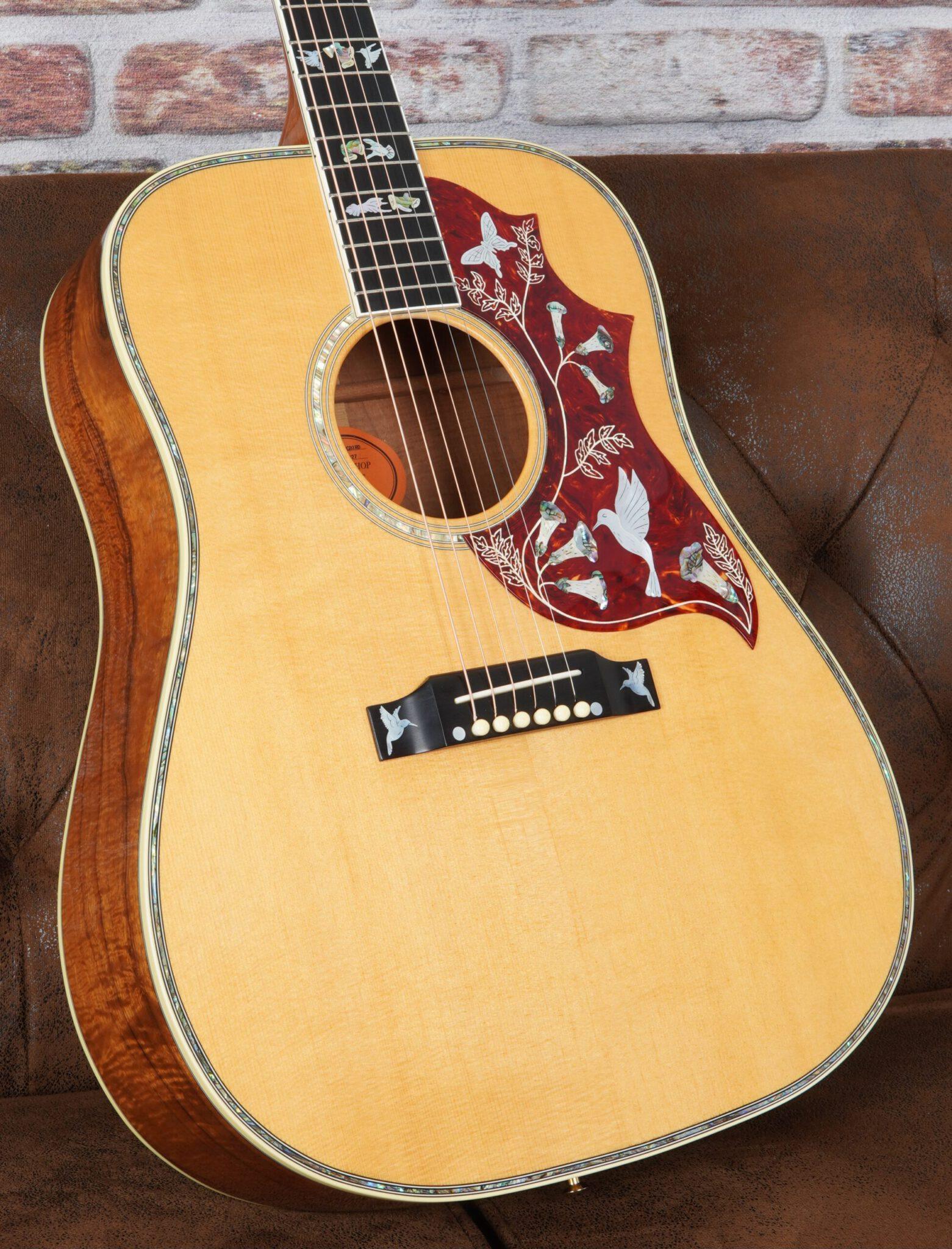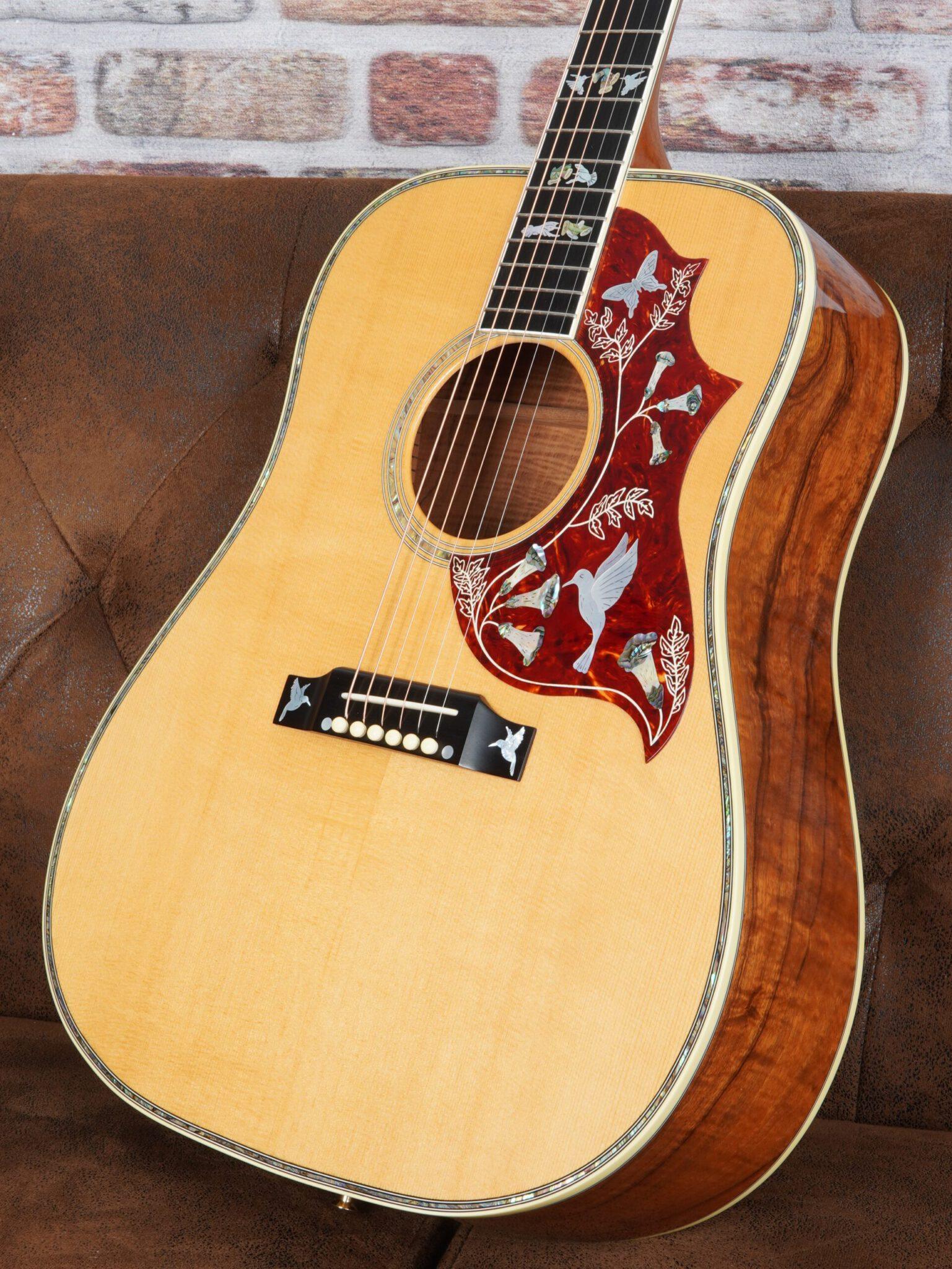 Die Gibson Hummingbird Custom Koa ist ein außergewöhnliches Instrument aus dem renommierten Gibson Custom Shop und zählt zu den schönsten Interpretationen eines absoluten Klassikers. Seit ihrer Einführung im Jahr 1960 gehört die Hummingbird zu den begehrtesten Akustikgitarren überhaupt. Sie steht für den warmen, charaktervollen Gibson-Sound, die elegante Ästhetik und den unverwechselbaren Klang, der Generationen von Musikern inspiriert hat. Dieses Custom-Modell hebt die Hummingbird auf ein neues Niveau – durch edelste Materialien, perfekte Verarbeitung und eine visuelle Präsenz, die sofort begeistert.