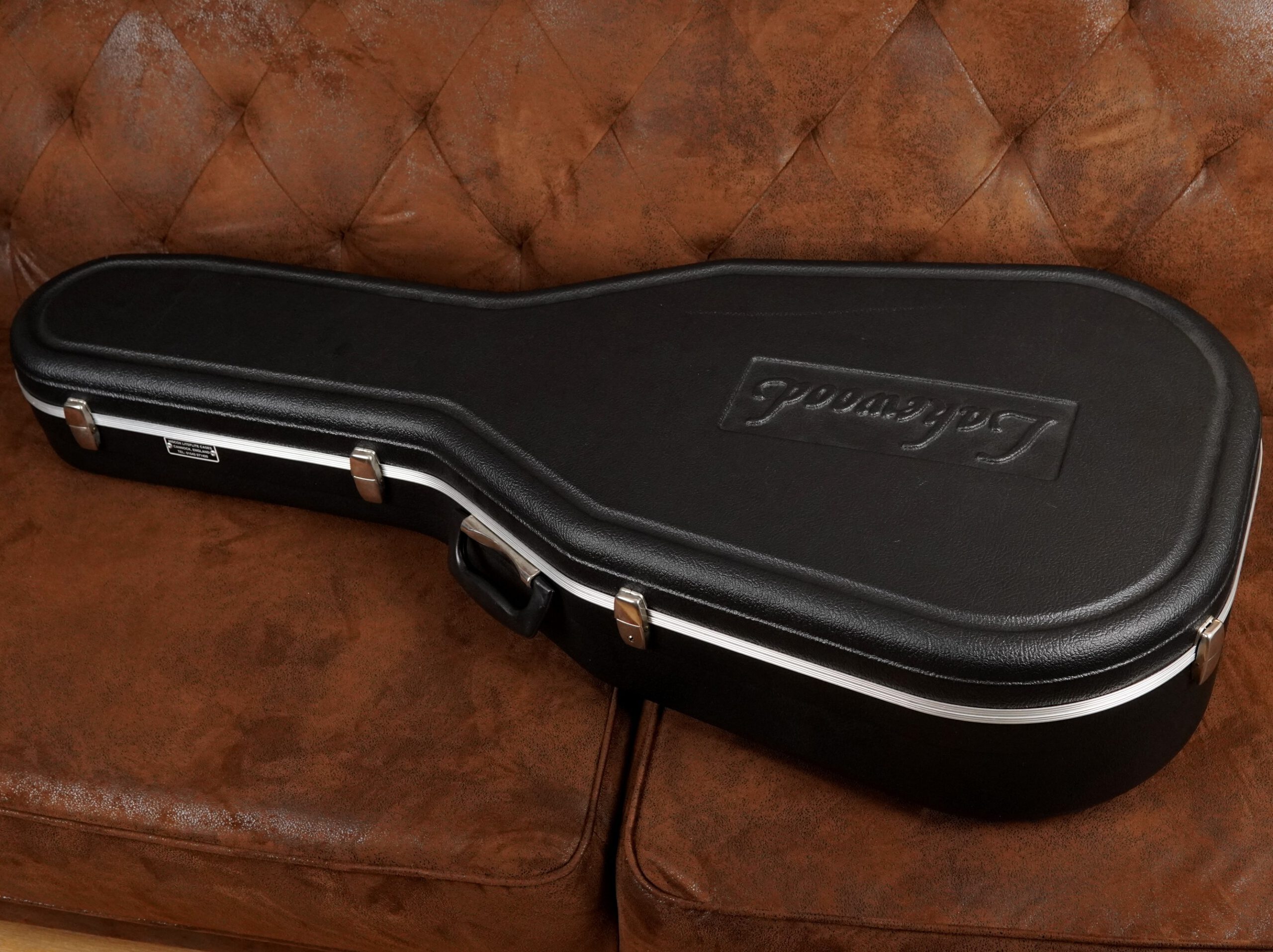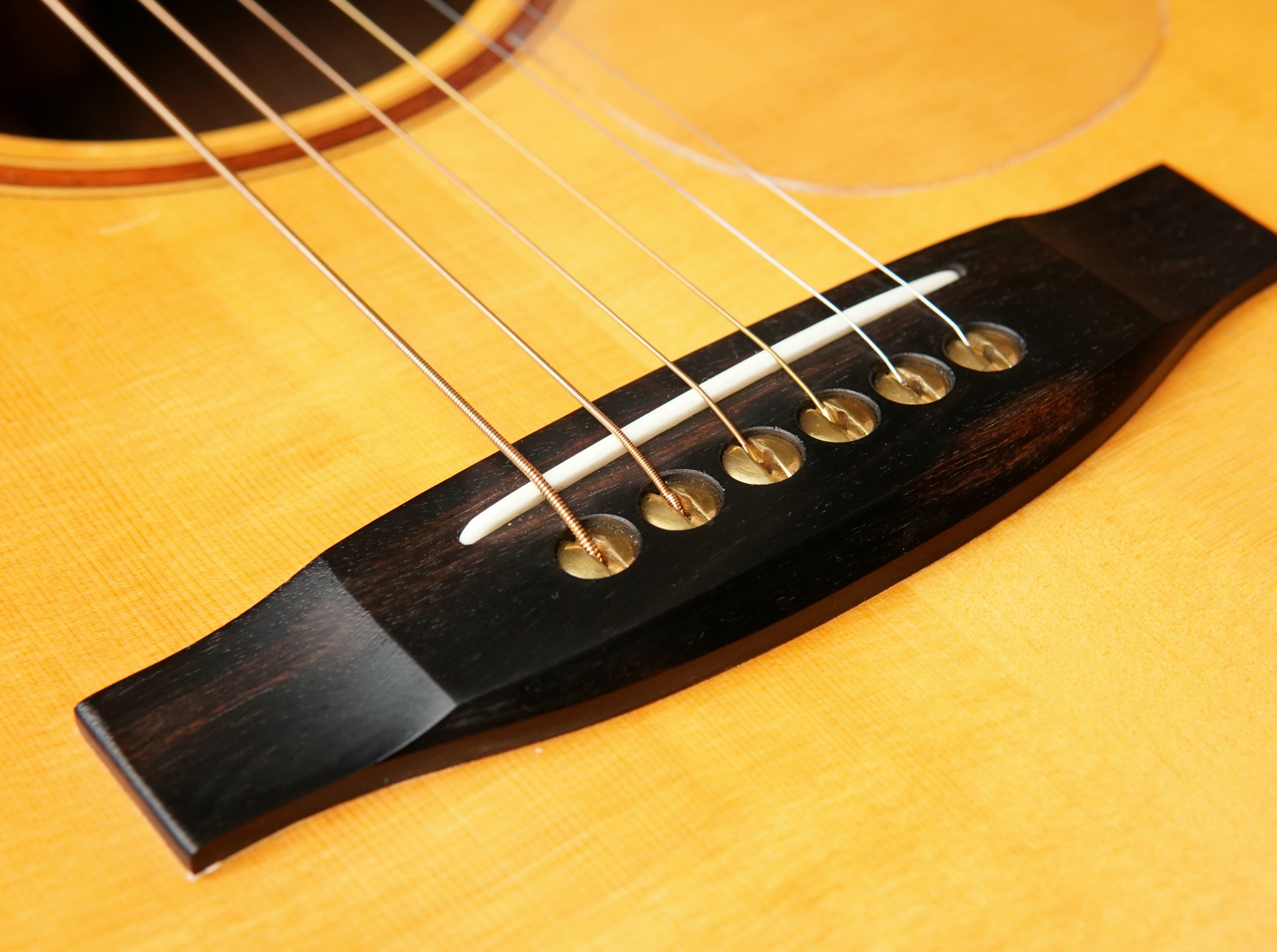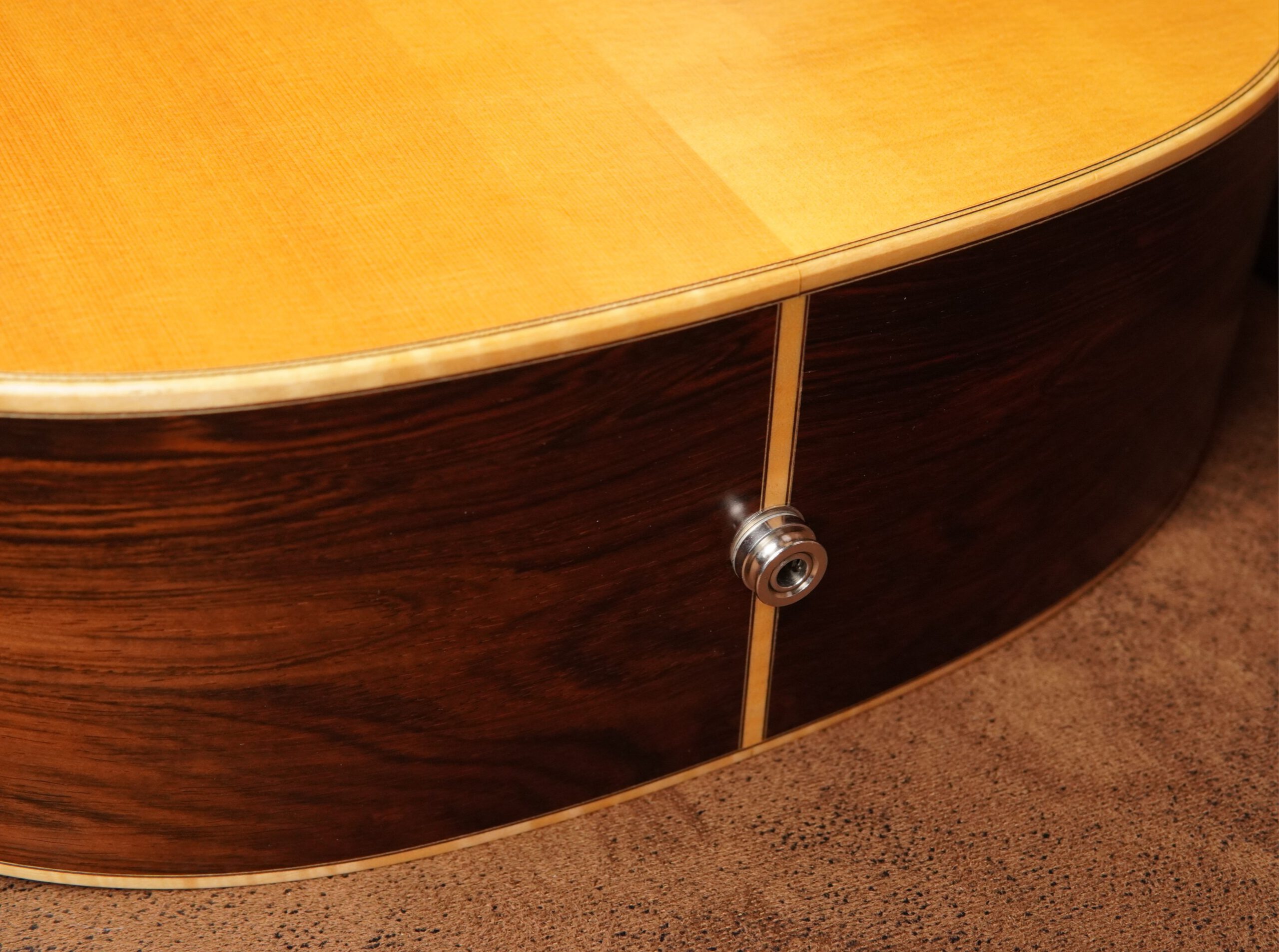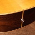 Nachträglich wurde ein pinloses Stegsystem mit integrierten Metall-Ferrulen installiert. Die Ball Ends der Saiten werden dabei direkt in präzise eingesetzten Metallbuchsen im Steg aufgenommen. Das reduziert die punktuelle Belastung des Holzes und sorgt für eine stabile, verschleißarme Saitenauflage. Durch den direkteren Kraftschluss wird zudem eine effiziente Schwingungsübertragung begünstigt. Die Modifikation wurde fachgerecht von einem Gitarrenbauer ausgeführt.