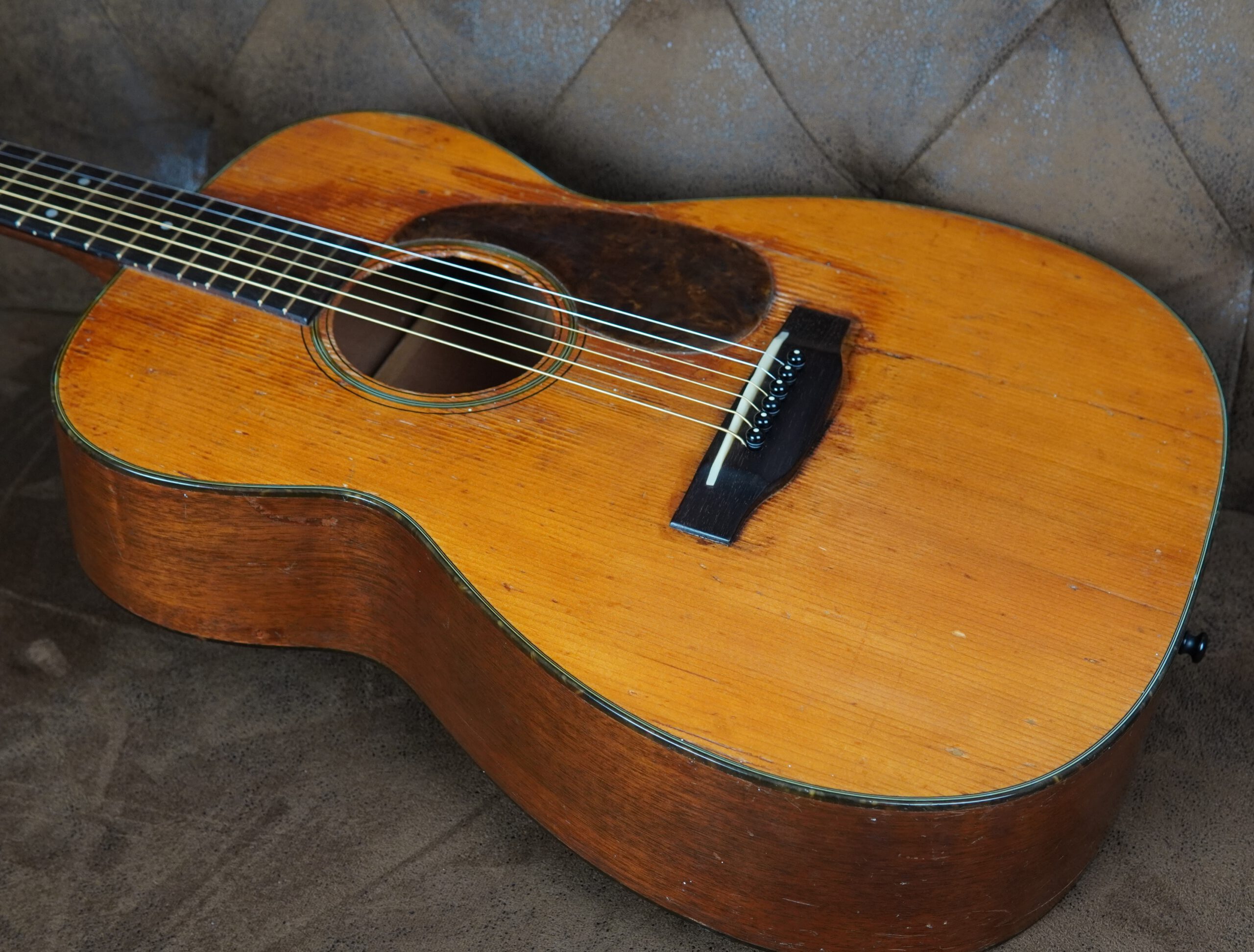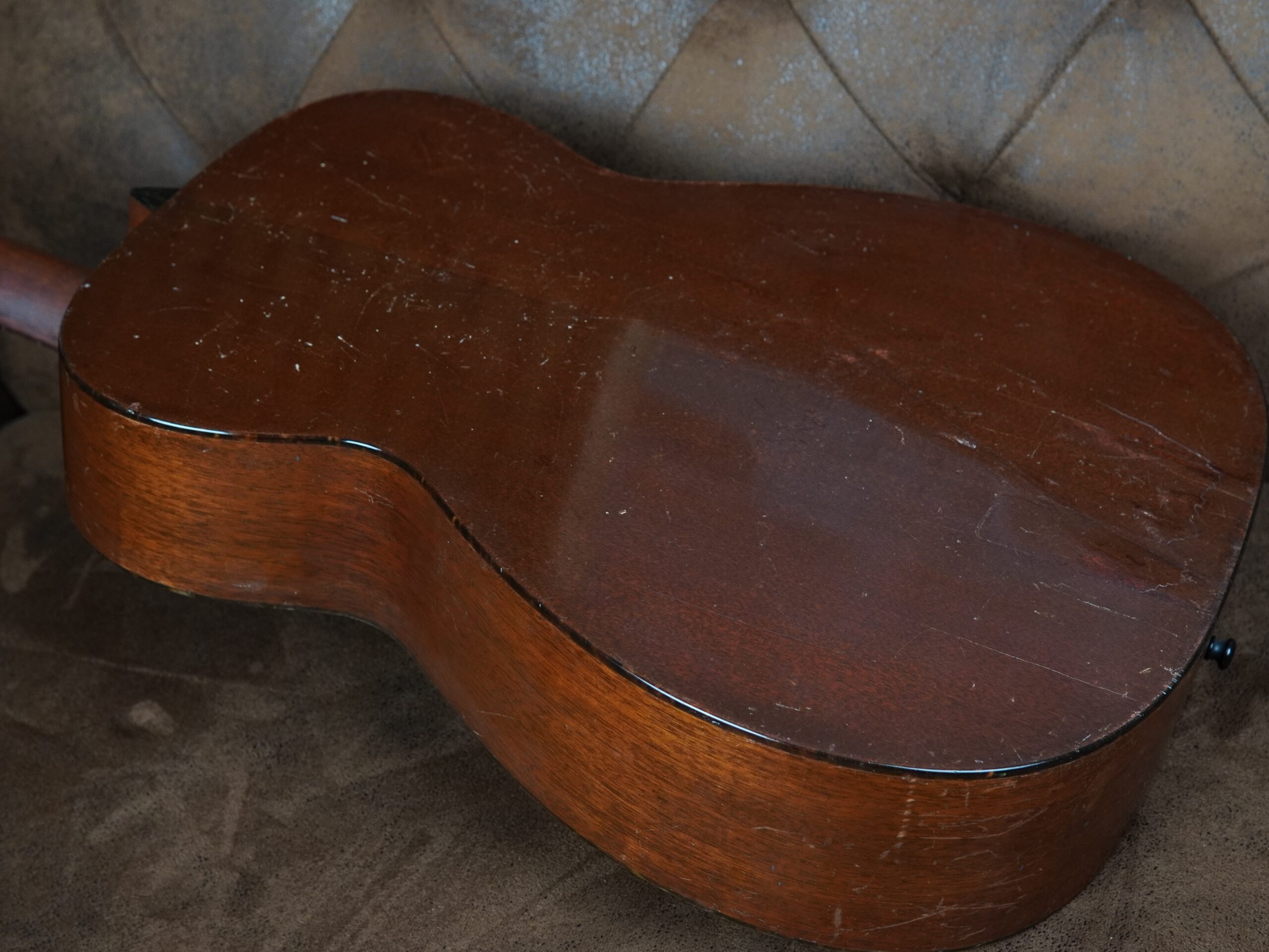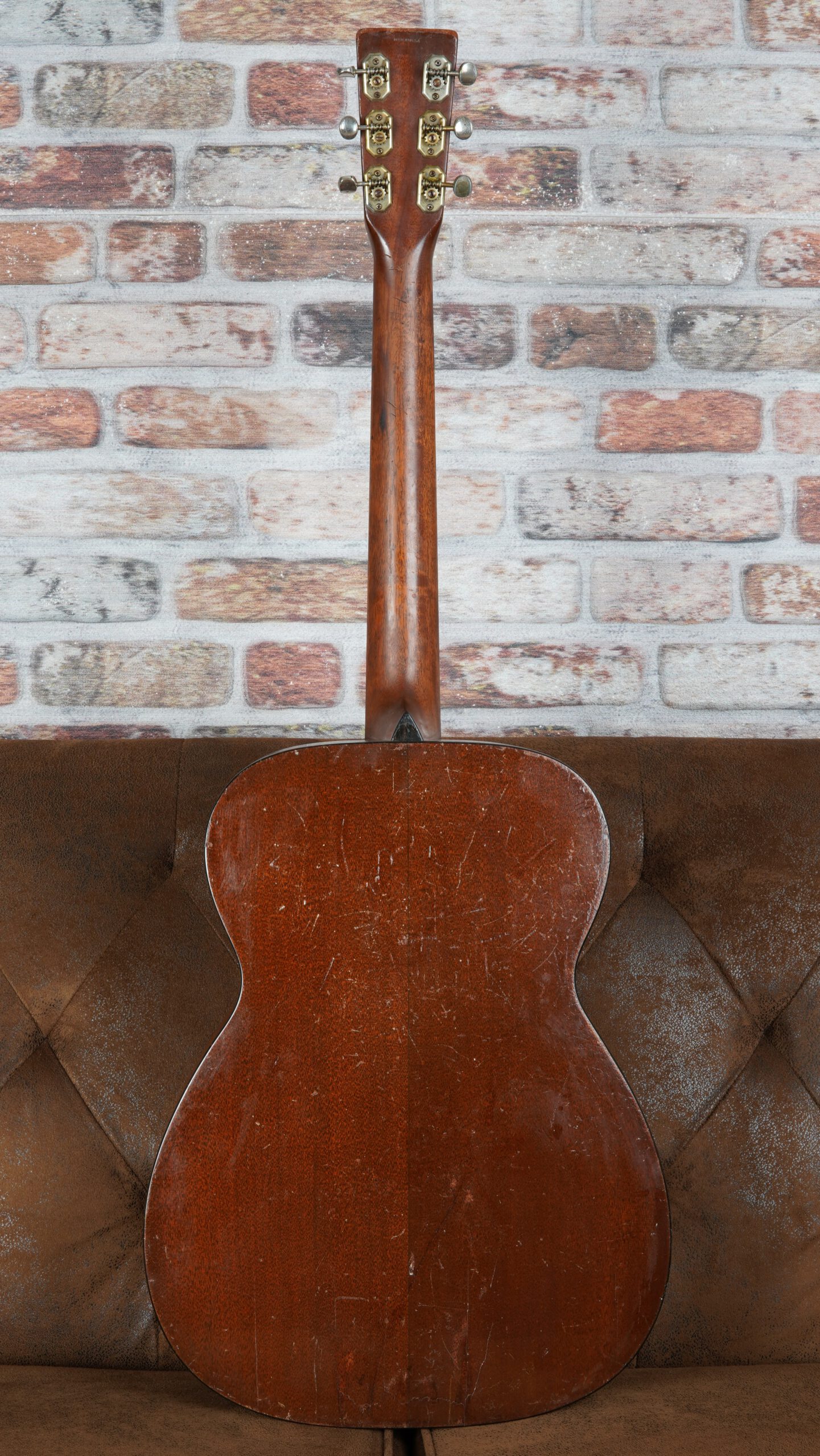 Klanglich überzeugt die Martin 00-18 1947 durch Direktheit, Dynamik und Ausdruck. Ihr Ton ist voll, warm und präsent – mit jener Tiefe und Reife, die nur echte Vintage-Gitarren besitzen. Sie reagiert feinfühlig auf jede Spielweise und liefert genau jene Mischung aus Klarheit, Sustain und Kompression, die für Martins aus den 1940er-Jahren typisch ist. Die originalen Mechaniken arbeiten präzise und zuverlässig. Optisch zeigt das Instrument unzählige Spielspuren die seine Geschichte unterstreichen.