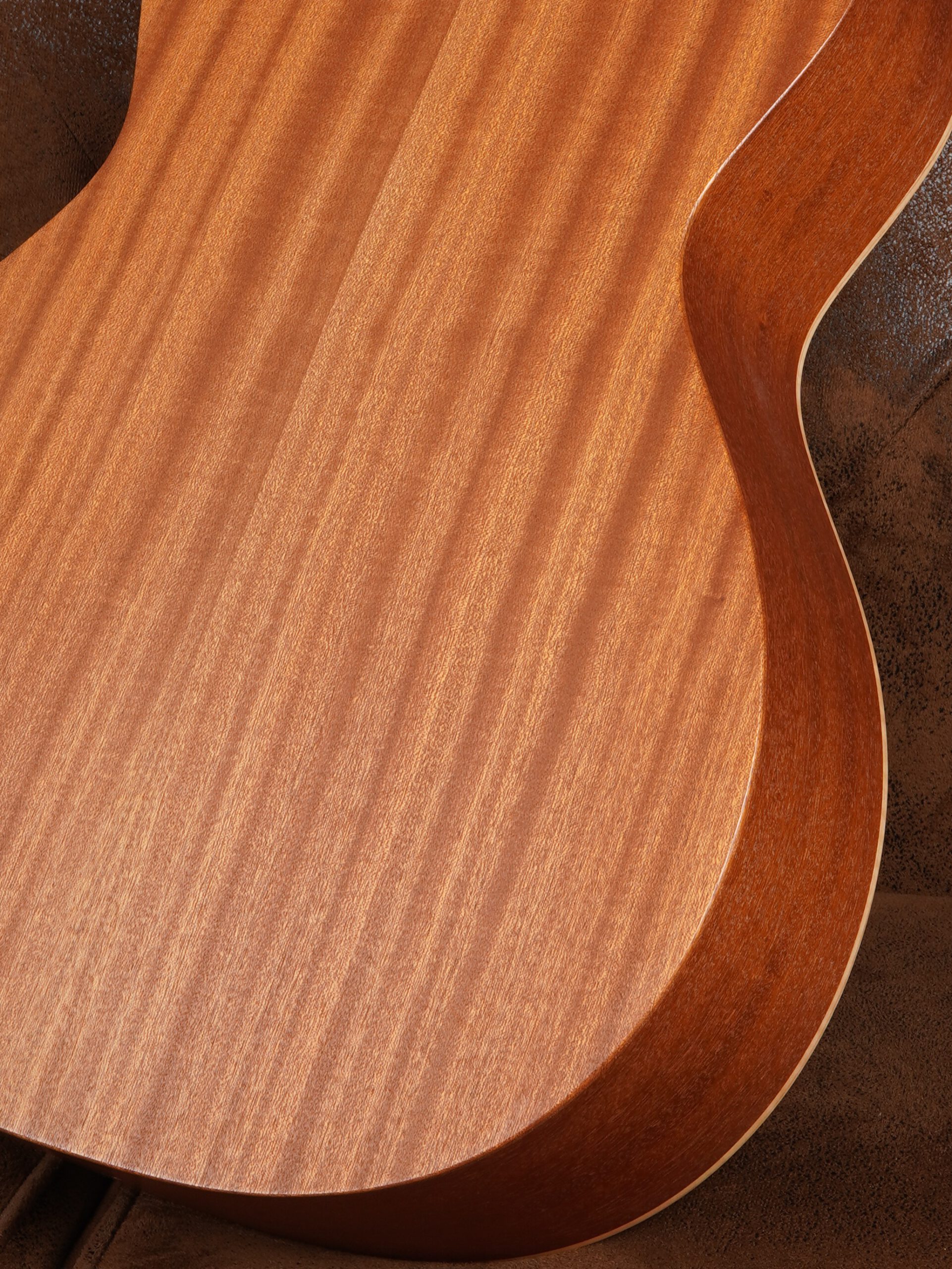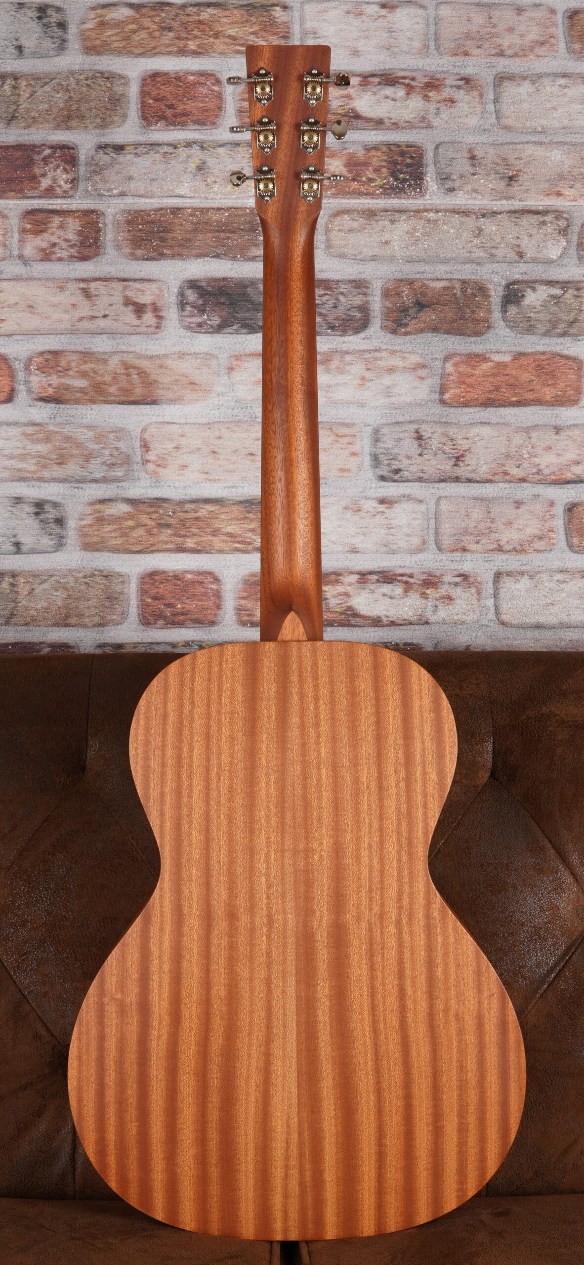 Die kompakte 00-Korpusgröße mit 14 Bünden bietet ein sehr komfortables Spielgefühl und richtet sich sowohl an Fingerstyle-Spieler als auch an Strummer, die eine handliche, ausgewogene Akustikgitarre suchen. Die massive Sitka-Fichtendecke sorgt für eine direkte Ansprache und gute Dynamik, während Boden und Zargen aus massivem Sapele dem Klang Wärme, Klarheit und ein ausgewogenes Mittenbild verleihen.