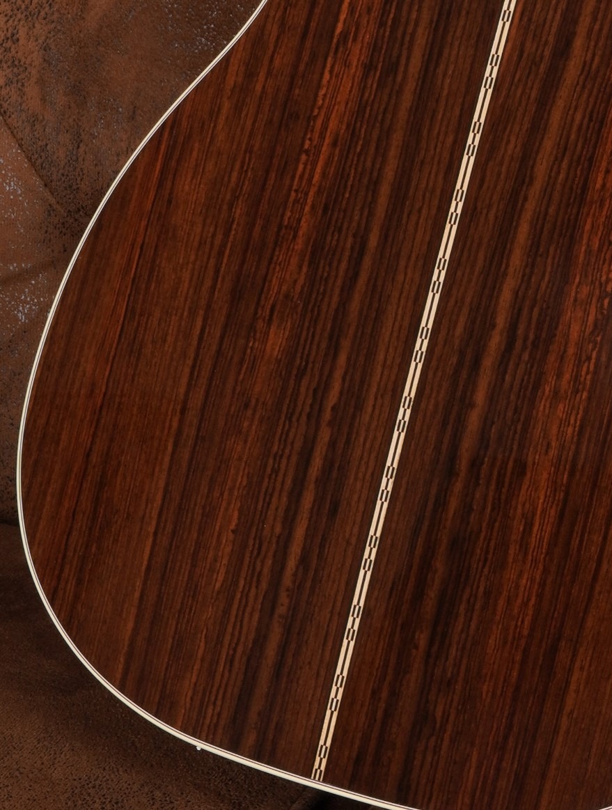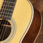 Optisch orientiert sich das Instrument an klassischen Martin-Details. Herringbone-Purfling, Antique-White-Binding, eine Multi-Stripe-Rosette sowie Abalone-Inlays im Diamonds & Squares Long Pattern verleihen der Gitarre eine elegante, zeitlose Erscheinung. Der Mahagonihals mit Modified Low Oval Profil sorgt dabei für eine sehr angenehme und moderne Bespielbarkeit.
