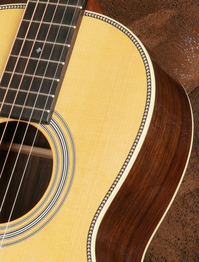 Für den Klang sorgt eine hochwertige Kombination aus massiver Adirondack-Fichtendecke und massivem ostindischem Palisander für Boden und Zargen. Diese Holzkombination liefert einen klaren, offenen und sehr ausgewogenen Ton mit brillanten Höhen, stabilen Mitten und einer für diese Größe beeindruckenden Tiefe. Die Gitarre reagiert sensibel auf feinste Anschlagsnuancen und bietet eine hervorragende Dynamik.