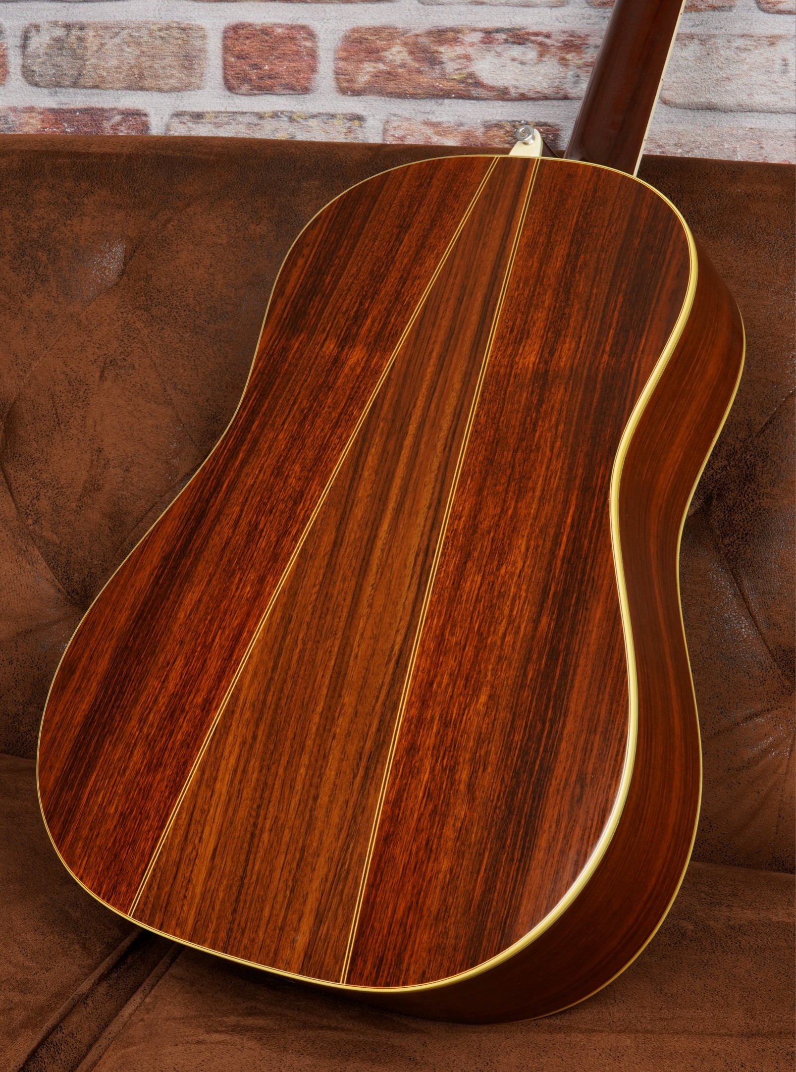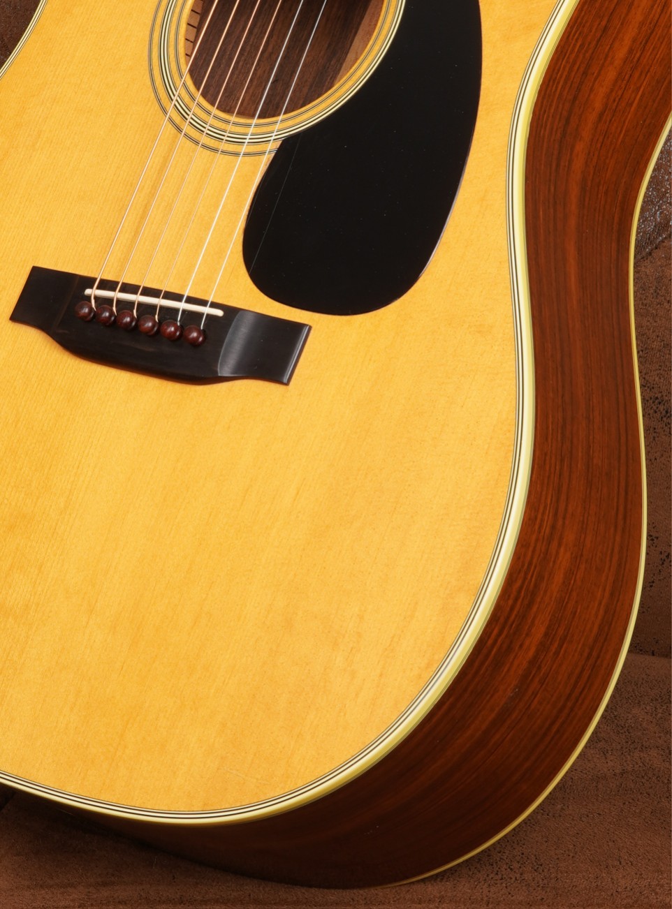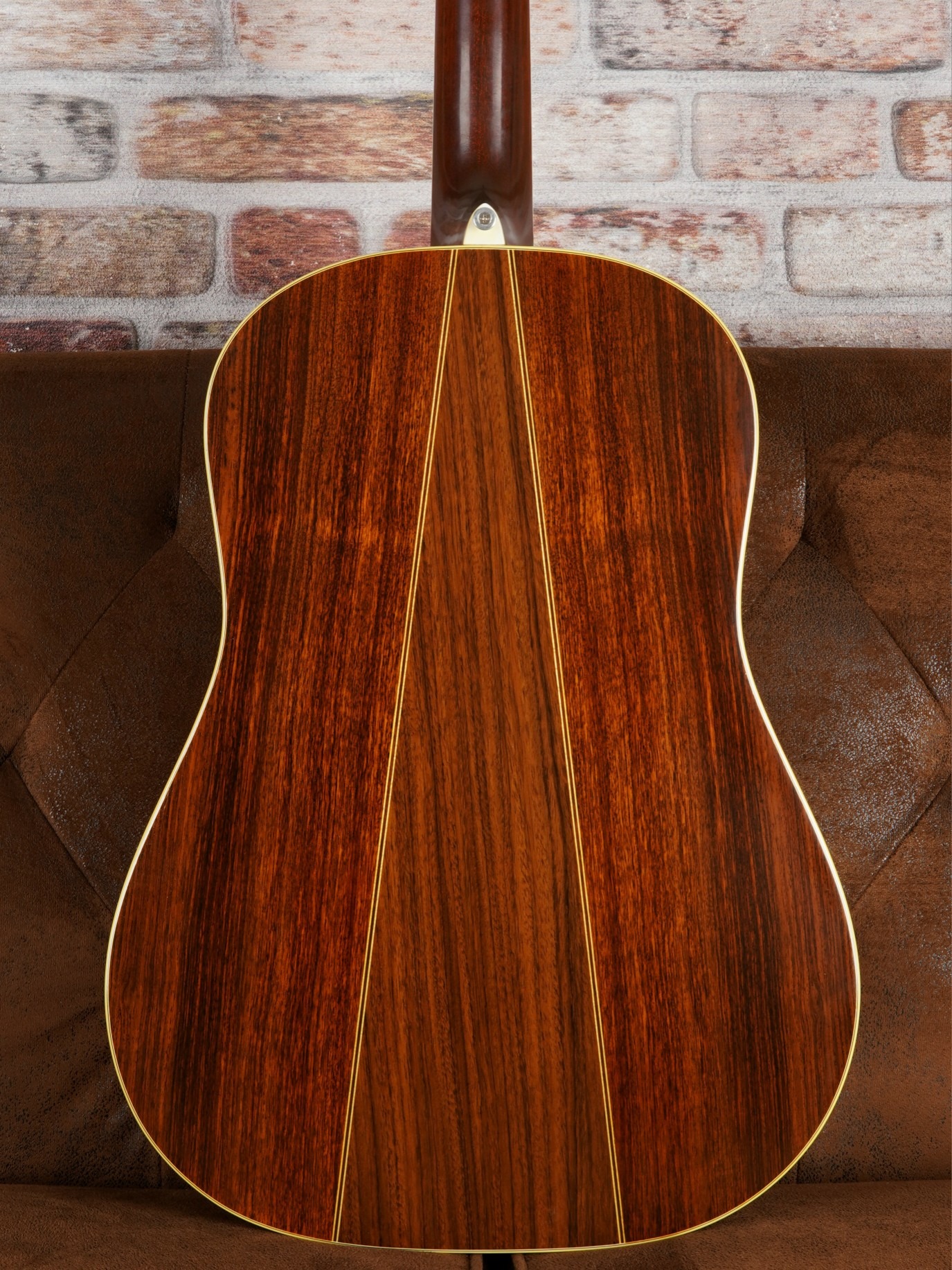 Die Martin D-35S 12 Fret 1974 gehört zu den besonders seltenen Varianten der klassischen D-35 und nimmt innerhalb der Martin-Historie eine Sonderstellung ein. Als 12-Fret-Dreadnought knüpft sie konstruktiv an die frühen Dreadnought-Modelle der 1930er-Jahre an, bei denen der Hals am 12. Bund in den Korpus übergeht. Diese Bauweise verschiebt die Brückenposition weiter in die Deckenmitte und sorgt für ein besonders volles, tiefes und tragendes Klangbild.