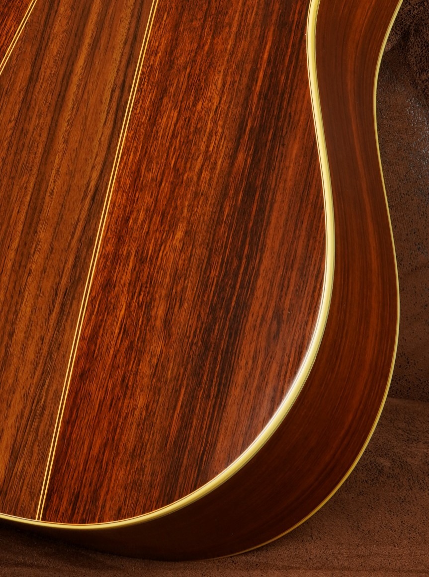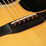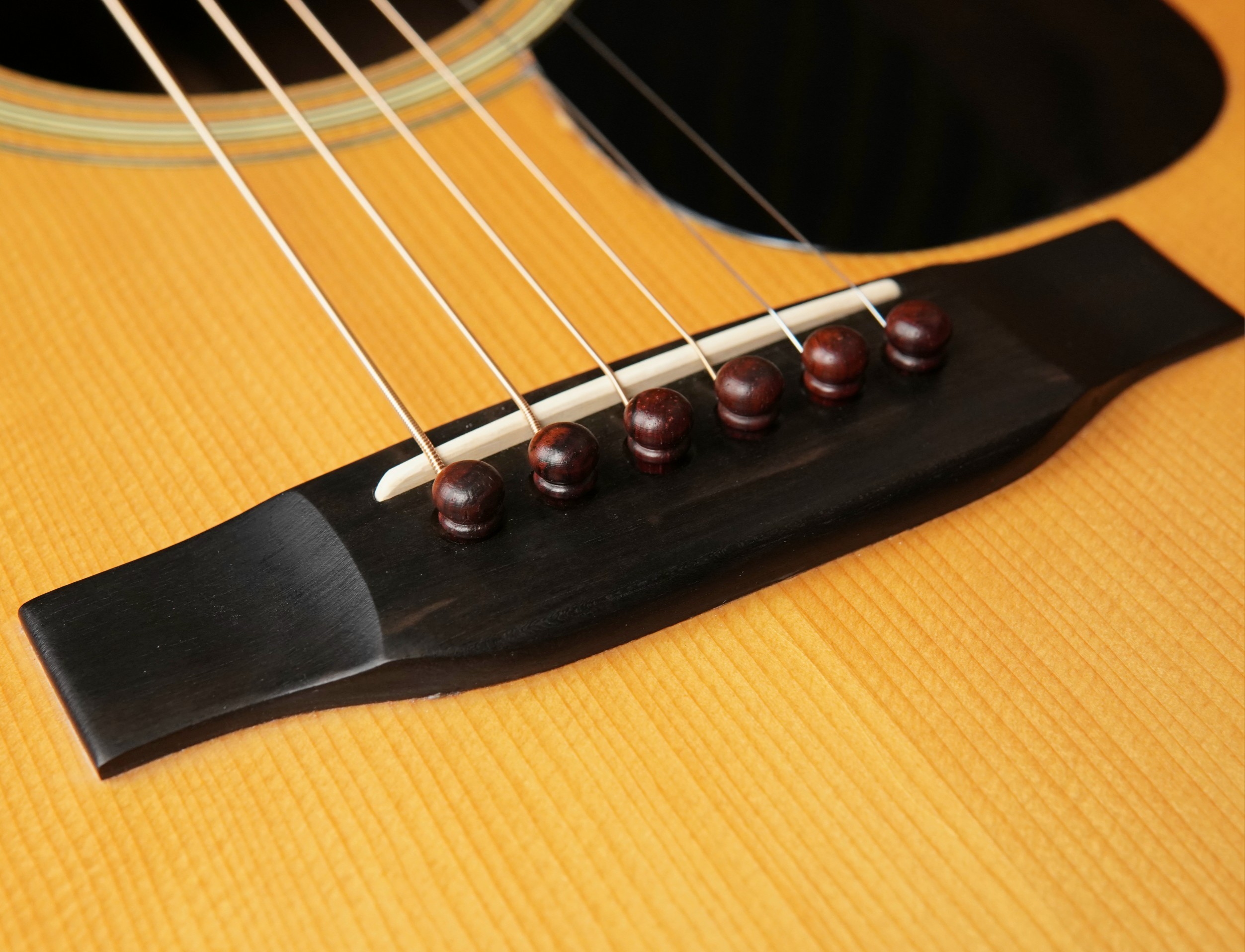 Die Stegeinlage wurde durch eine Stegeinlage aus fossilem Mammutelfenbein ersetzt, die originale Stegeinlage liegt bei. Ebenso wurden die Bridge Pins gegen hochwertige Pins aus Koa-Holz getauscht, die originalen Pins sind ebenfalls vorhanden. Die Saitenlage ist komfortabel eingestellt und beträgt 2,6 mm an der tiefen E-Saite und 2,1 mm an der hohen e-Saite am 12. Bund. In Kombination mit der breiten Sattelbreite von 47,6 mm ergibt sich ein sehr souveränes, entspanntes Spielgefühl.